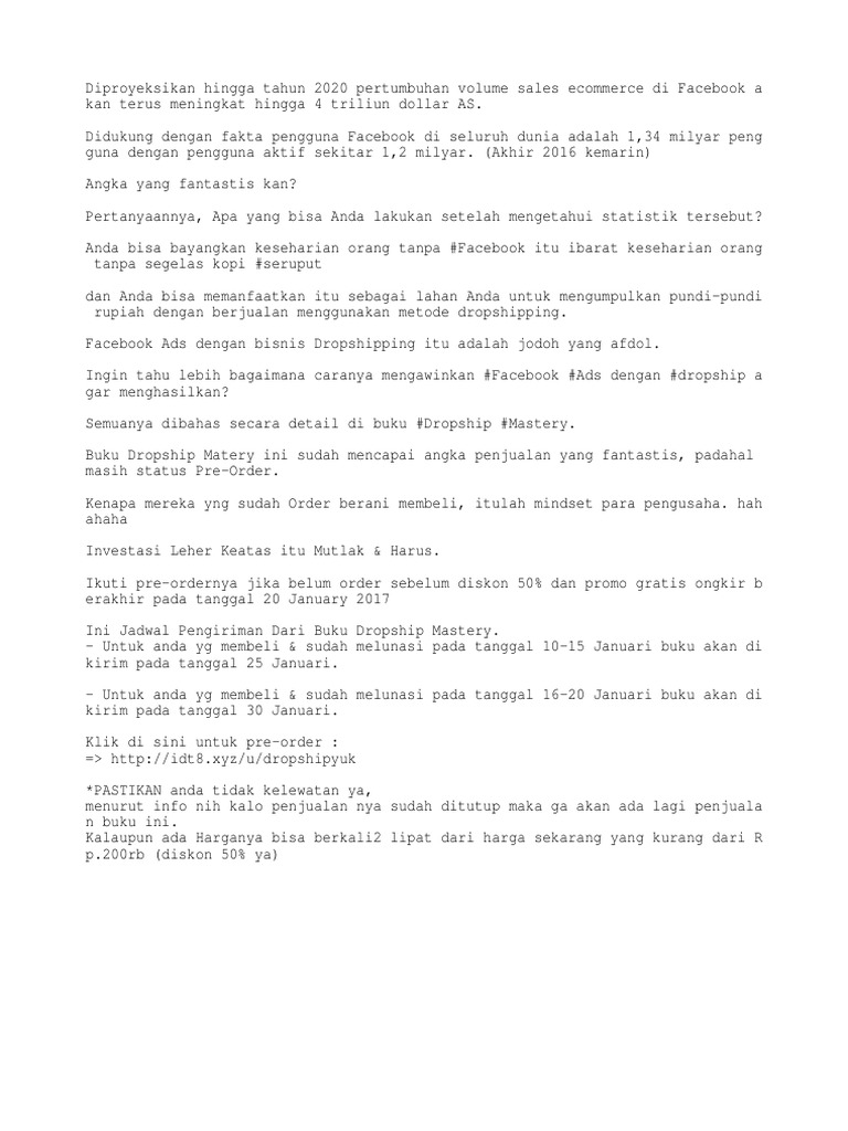 Buku Fisik Dropship Mastery Shopee Indonesia from cf.shopee.co.id Dropship mastery karya rico huang dan seno aji airlangga: Anda akan mendapatkan sebuah ebook yang didalamnya berisi panduan yang dapat membantu anda membuat headline yang menarik dan menciptakan sales copy untuk memikat hati calon customer anda. Info über dropship ecommerce auf seekweb. Jualan laris tanpa tatap muka, tanpa stok barang, tanpa sewa toko, tanpa harus punya karyawan pelajari bagaimana saya menjalankan bisnis dropship berawal dari 0 karyawan Jualan laris tanpa tatap muka, tanpa stok barang, tanpa sewa toko, tanpa harus punya karyawan. Dilarang mengcopy dan memperbanyak sebagian atau seluruh isi buku Rico huang seno aji airlangga desain cover & llustrasi: Feb 11, 2017 · ulasan buku: