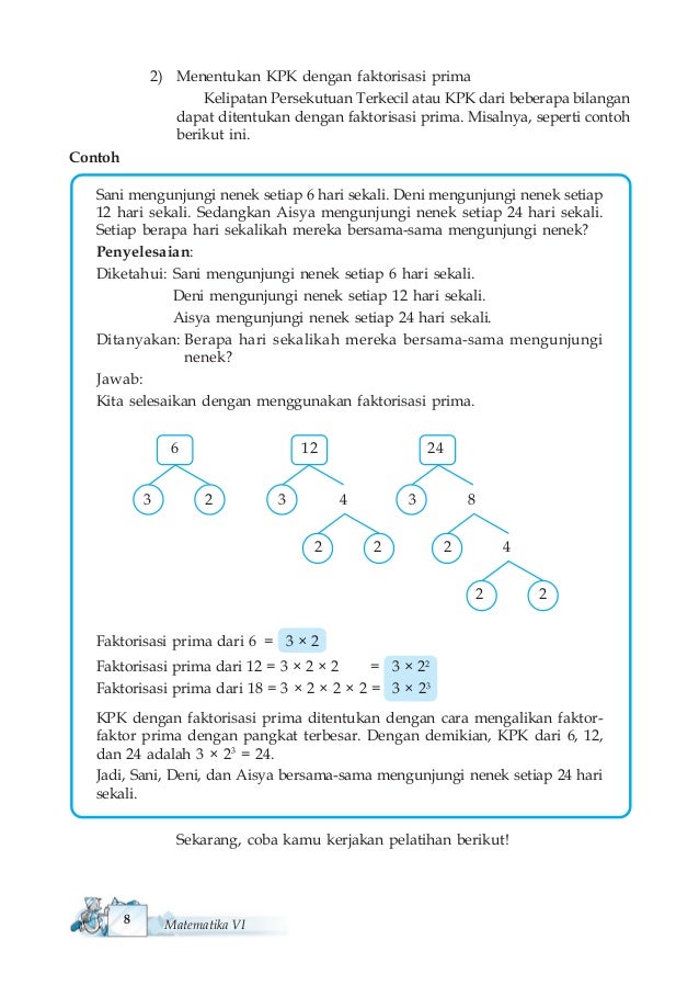 Matematika Untuk Sd Mi Kelas Vi from image.slidesharecdn.com Jadi factor yang bersekutu dengan pangkat terkecil adalah 2 dan 3. Gcd atau fpb dari 2 bilangan adalah suatu bilangan terbesar yang dapat membagi habis kedua bilangan. Faktorisasi prima dari 15 = 3 x 5. Berikut akan diberikan contoh soal beserta pembahasannya dengan. Bilangan prima adalah bilangan yang habis dibagi dengan bilangan itu sendiri dan bilangan 1. Cara mencari faktorisasi prima suatu bilangan menggunakan pohon faktor adalah dengan membagi angka 15 tidak merupakan bilangan prima, karena mempunyai lebih dari 2 faktor yaitu 1, 3, 5, 15 1. Kelipatan persekutuan terkecil adalah hasil kali 2 bilangan dengan bilangan asli yang hasilnya sama dan merupakan bilangan yang paling kecil. Untuk memperoleh faktorisasi prima langkah lebih mudah bisa menggunakan pohon faktor seperti contoh.