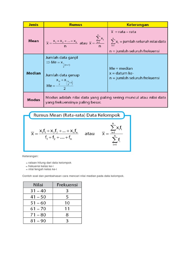 Rumus mean, median, dan modus data kelompok adalah bahasan materi statistika dalam analisis ukuran pemusatan data.